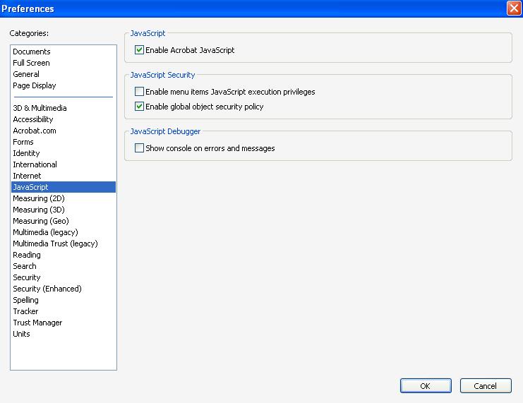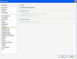Earlier in the year Adobe’s Acrobat Reader fell under attack do to a flaw in the way it processes JavaScript inside of PDFs. This was especially shocking to me because I had no idea you could even embed JavaScript inside of a PDF. Thankfully this has since been patched, however scripting is one of those things that seems to attract continuous attacks. Therefore I am going to walk you through how to turn off JavaScript inside of your favourite PDF reader, so long as your favourite PDF reader is either Acrobat Reader or Foxit Reader 😛