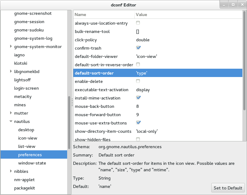 dconf write /org/gnome/nautilus/preferences/default-sort-order type