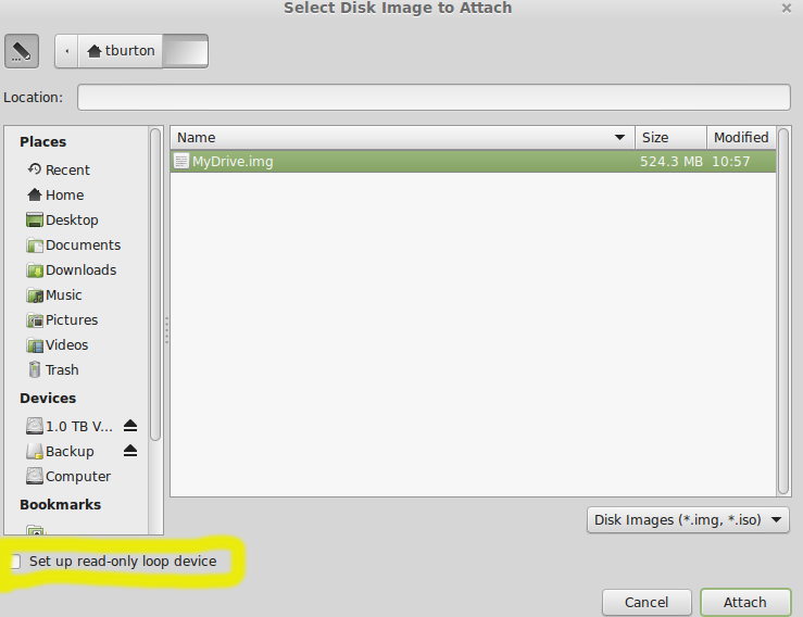 Be sure to uncheck “Set up read-only loop device”. If you leave this checked you won’t be able to format or write anything to the volume. Select the file and click Attach.