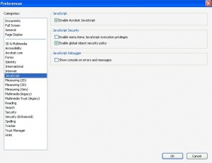 Earlier in the year Adobe’s Acrobat Reader fell under attack do to a flaw in the way it processes JavaScript inside of PDFs. This was especially shocking to me because I had no idea you could even embed JavaScript inside of a PDF. Thankfully this has since been patched, however scripting is one of those things that seems to attract continuous attacks. Therefore I am going to walk you through how to turn off JavaScript inside of your favourite PDF reader, so long as your favourite PDF reader is either Acrobat Reader or Foxit Reader 😛
