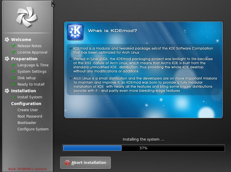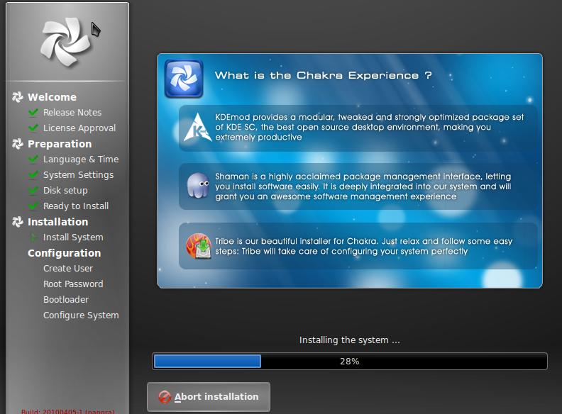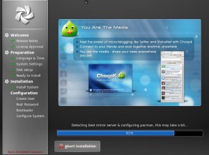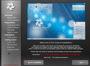The Chakra Project looks very promising, albeit very unpolished at the moment. If they can manage to fix up the rest of the distribution, getting it just as polished feeling as the installer, this will definitely be one to look out for. I look forward to trying it out again once it hits a stable release.