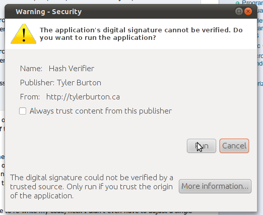 Java Web Start is a technology that allows easy deployment of Java based software through a web browser. The advantages of this framework are numerous but one nice thing is that it allows you far more freedom then the completely sandboxed Java applet. In this post I will detail how I converted my Hash Verifier application to run right from the browser.