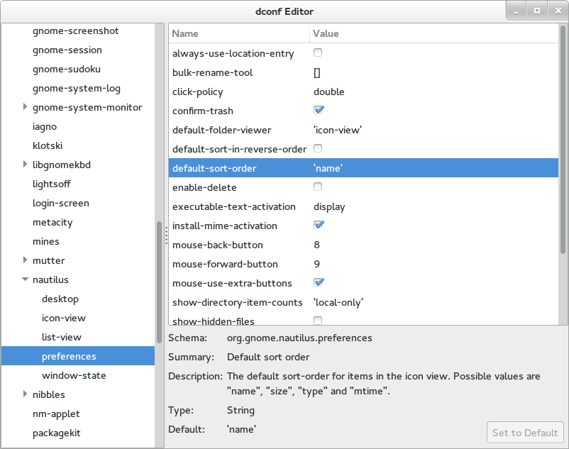 The default sort order in Nautilus has been changed to sorting alphabetically by name and the option to change this seems to be broken. For example I prefer my files to be sorted by type so I ran