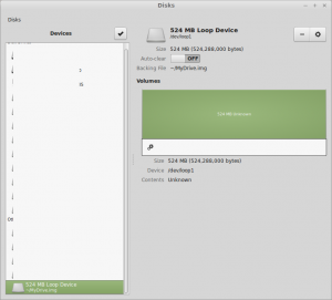 From this popup you can select the filesystem type and even name the drive. You may also use the “Erase” option to write zeros to the file if you wanted to do it here instead of via the terminal as shown previously. In the image above the settings will format the drive using the ext4 filesystem. Click Format, confirm the action and you’re done. Disks will format the file and even auto-mount it for you. You can now copy files to your mounted virtual drive. When you’re done simply eject the drive like normal or press the square Stop button in Disks. To use that same volume again in the future just re-attach the disk image using the steps above.