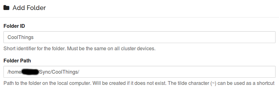 - Folder Path: This is where you want it to store the files on the local computer. For example on Computer 1 I might wan this to be ~/Sync/MyShare but on Computer 2 it could be /syncthing/shares/stuff.
