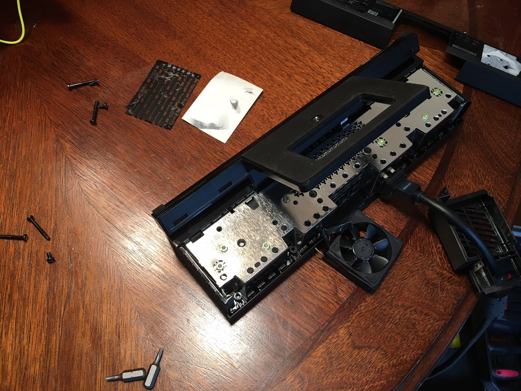Taking the stickers off the bottom of the Kinect and undoing the Torx security screws I was able to pull the fan out of the unit. After a good cleaning with a few blasts of compressed air I could see that there was nothing wrong with the fan itself and concluded that the problem was likely issue #3 described above. As this point I did something pretty dumb – I cut two random wires because someone in a YouTube video told me to… Allegedly of the four wires connecting the fan to the Kinect only two of them are important: red & black, which I’m assuming are for power and ground, and yellowish-white & blue, for fan control. Because it looked like the fan is never being told to run cutting the second set of wires apparently forces the fan to run non-stop as soon as power is supplied. So I went ahead and cut the yellowish-white and blue wires as instructed.
