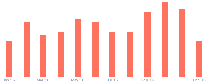 Around this time last year I was gifted a Fitbit Charge HR. Since then it unfortunately needed to be replaced (now with a new Fitbit Charge 2!) but I thought it would be interesting to take a look at my stats for the year. Now obviously December isn’t over yet so some of the stats for that month will be low but all the same I think these graphs are pretty neat to look at.